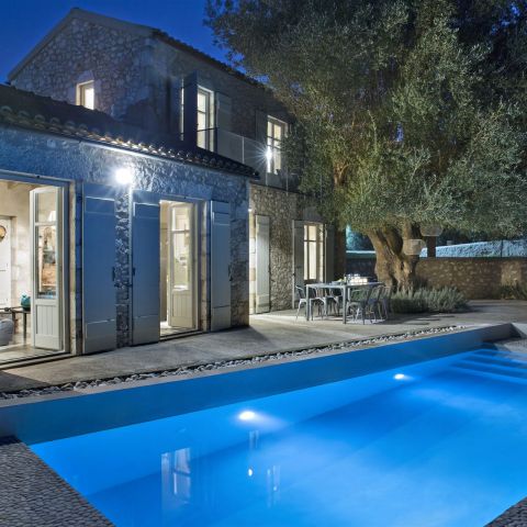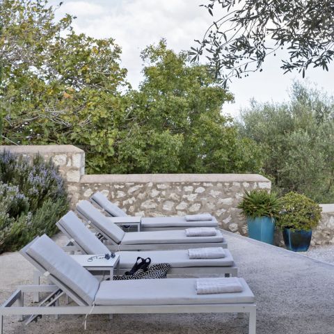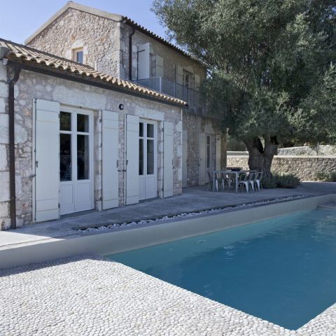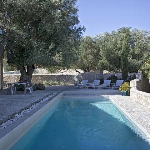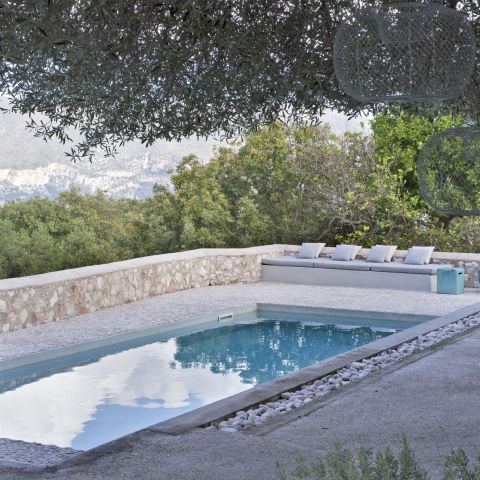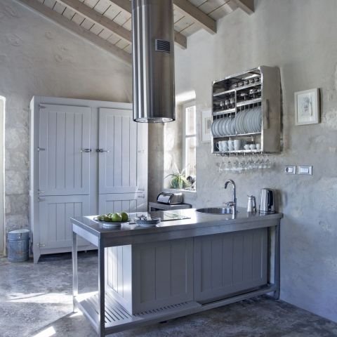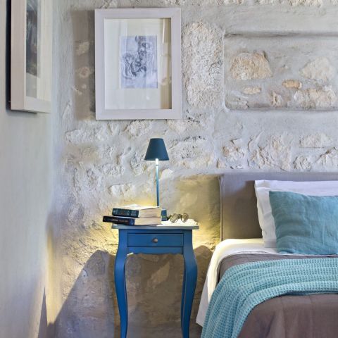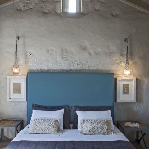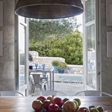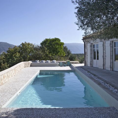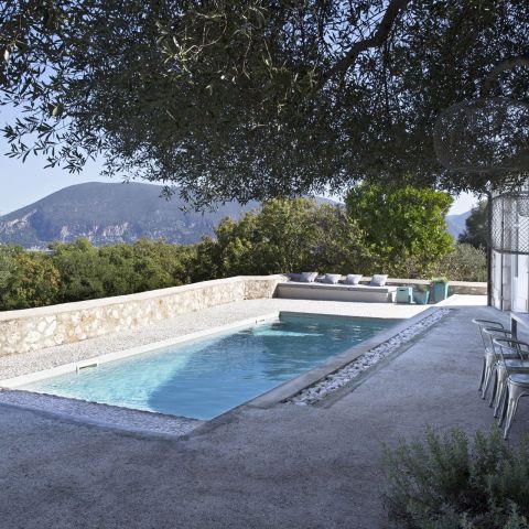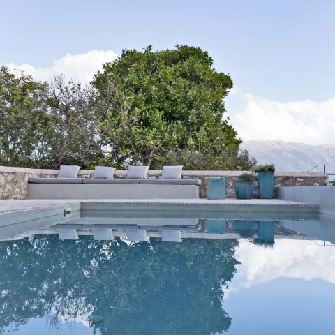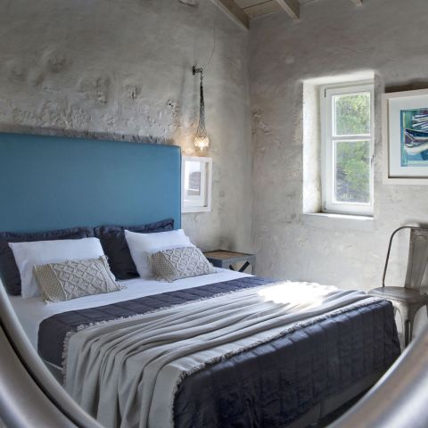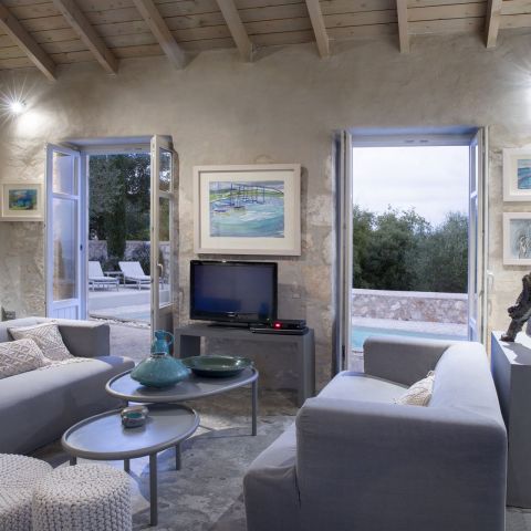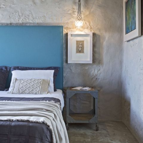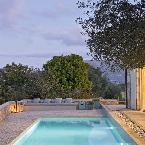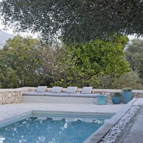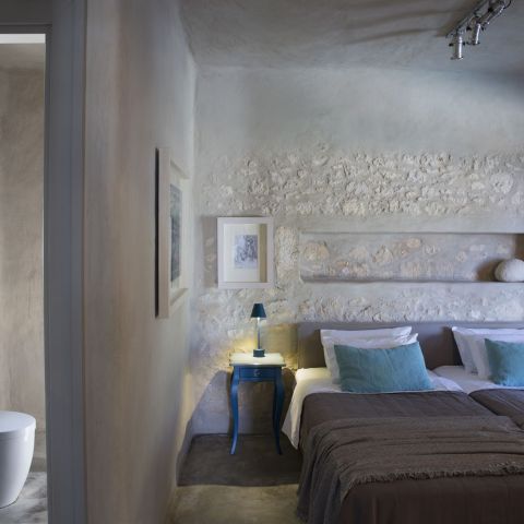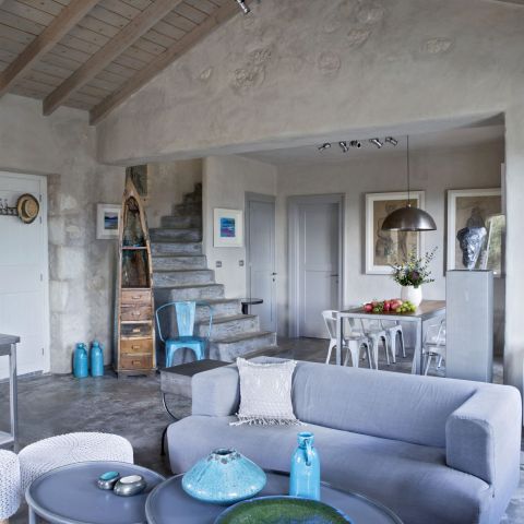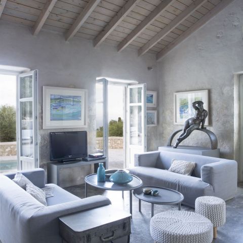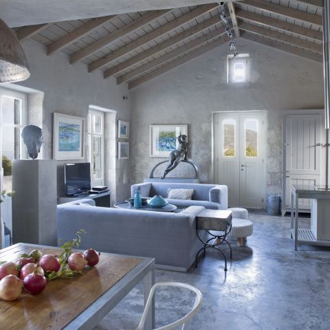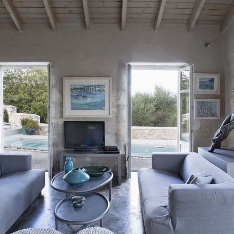 Warm shades of grey and taupe reminiscent of the ancient olive trees, and blue green tones like the hidden underground lakes, create the absolute island home.
