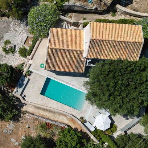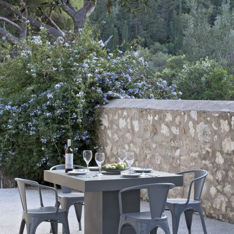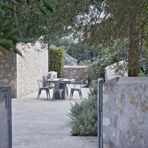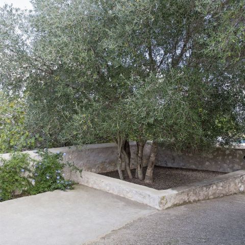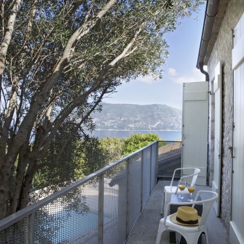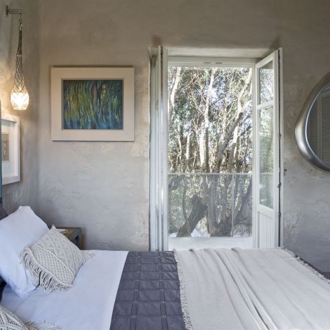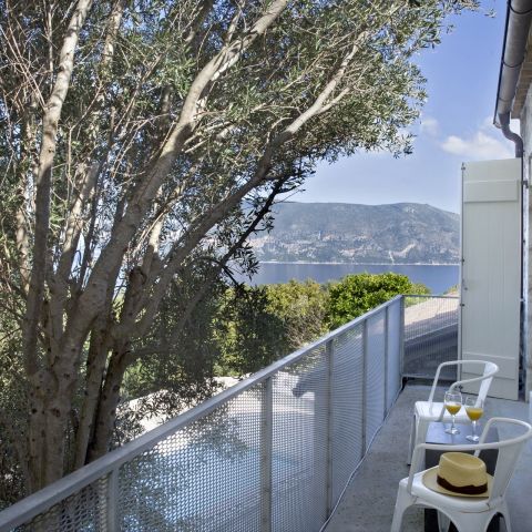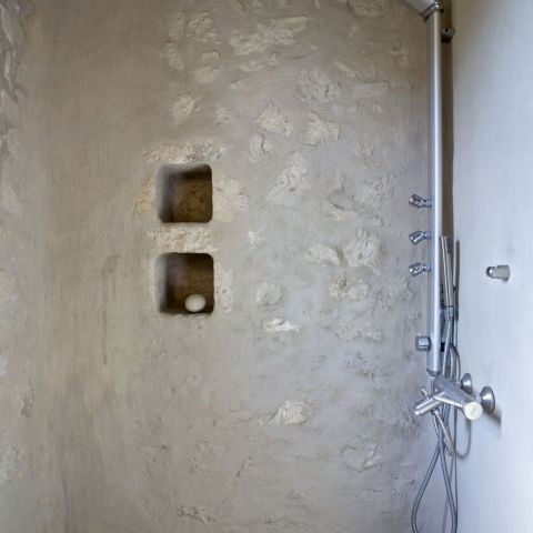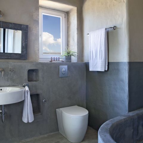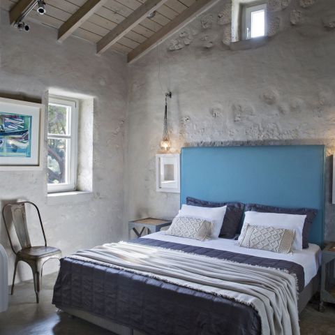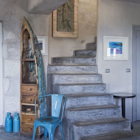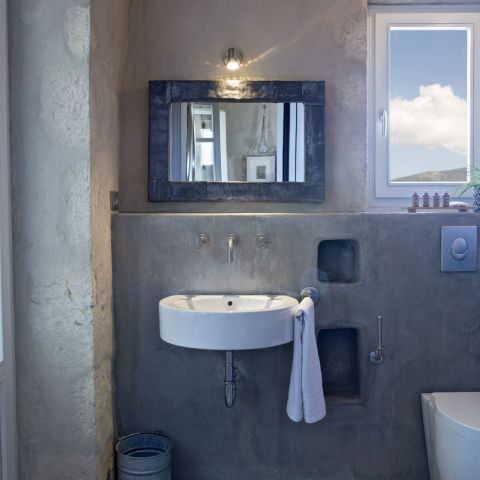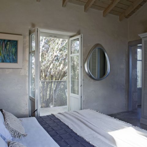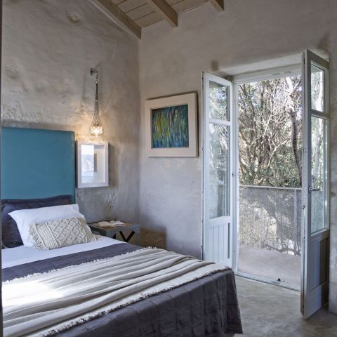 A polished concrete staircase leads up to the master bedroom with a charming double bed and a bathroom with the most stunning view of the sea. Both have access to a private balcony that nestles among the branches of the olive tree.